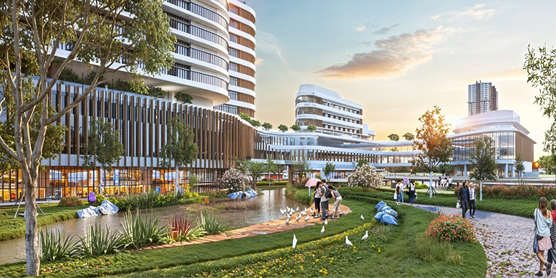 The hospital’s design integrates sustainable and therapeutic elements, with extensive green spaces, rooftop gardens, and a serene eco-trail around a central lake, creating a calming environment that promotes mental and physical well-being. Passive cooling strategies, energy-efficient systems, and shaded facades contribute to a sustainable and comfortable interior, reducing environmental impact while optimizing energy use.